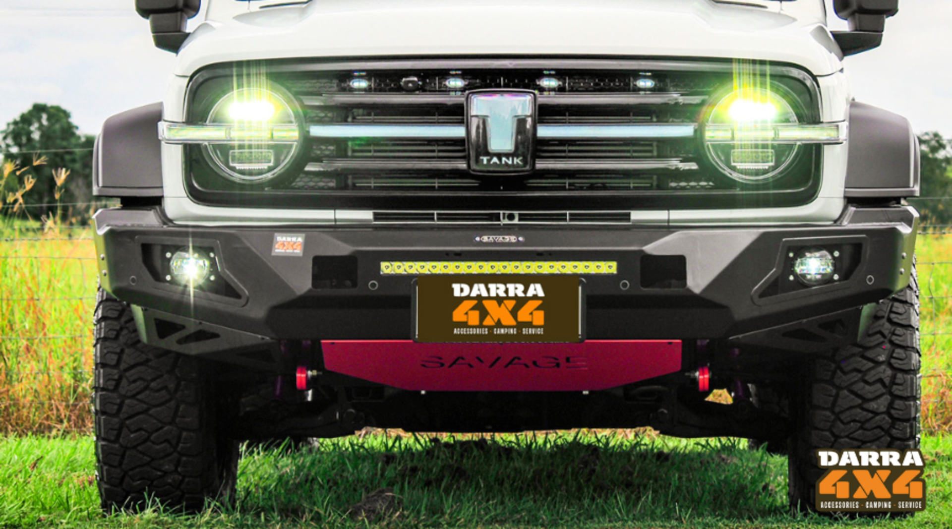 Front and center in its arsenal is the Savage Tech Bullbar & Bash Plate, a robust addition that not only enhances the Tank 300's aesthetics but also provides crucial protection underbelly and against front-end impacts. Crafted to withstand the rigors of off-road adventures, this bullbar ensures that your vehicle's front end remains unscathed, allowing you to navigate rough terrain with confidence and peace of mind. This Bullbar includes bash plate, LED fog light with cut off lens, LED blinker, LED DRL, 22 inch LED light bar, two 20mm thick recovery points, coming in with an approximate weight of 60kg (including Bash Plate).