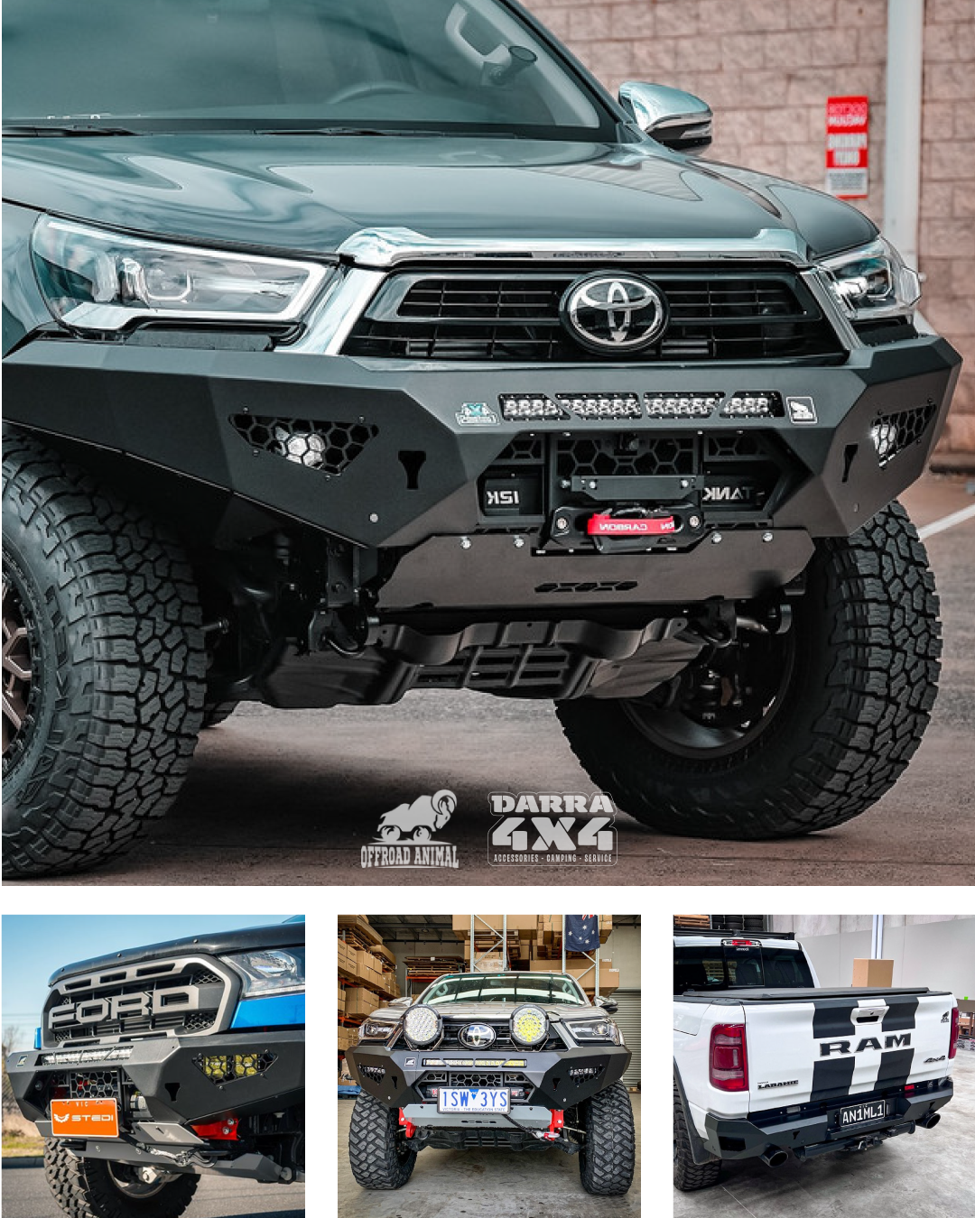 Offroad Animal Bumpers combine heavy-duty steel construction with a modern, rugged design. Engineered for tough terrain, they provide excellent protection while offering mounts for essential off-road accessories.