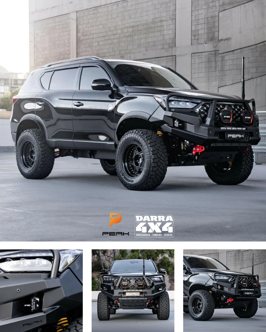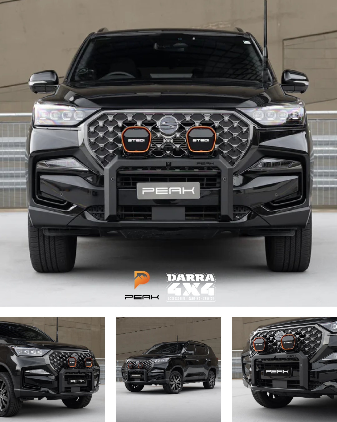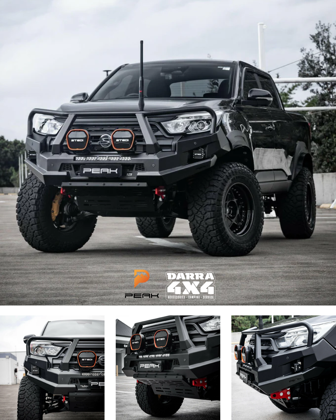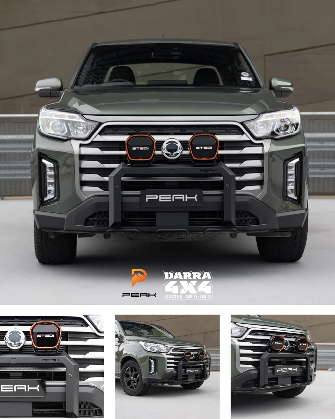 PEAK Steel Nudge Bar for SsangYong Musso offers sleek protection with 3mm steel construction, easy installation, accessory mounts, sensor integration, and a durable powder-coated finish. Fits all Musso models (2018-current) and is airbag compatible.